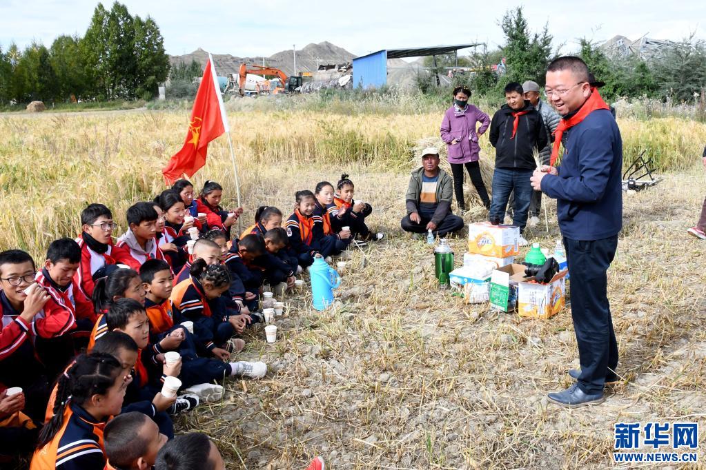 援藏教師潘傑帶著學生在青稞地裏上思政課(9月14日攝)。