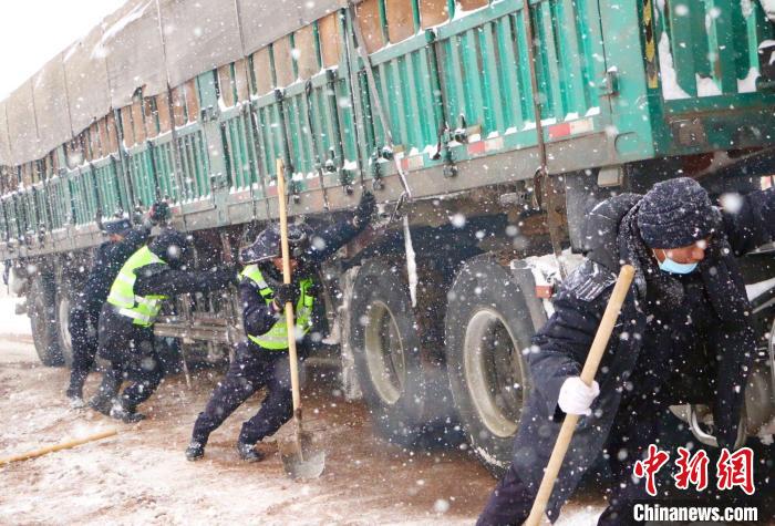 圖為(wei) 2021年4月,國道109線安多段大雪致車輛通行困難,那曲市安多縣公安民警進行除雪保通。資料圖 西藏自治區公安廳供圖