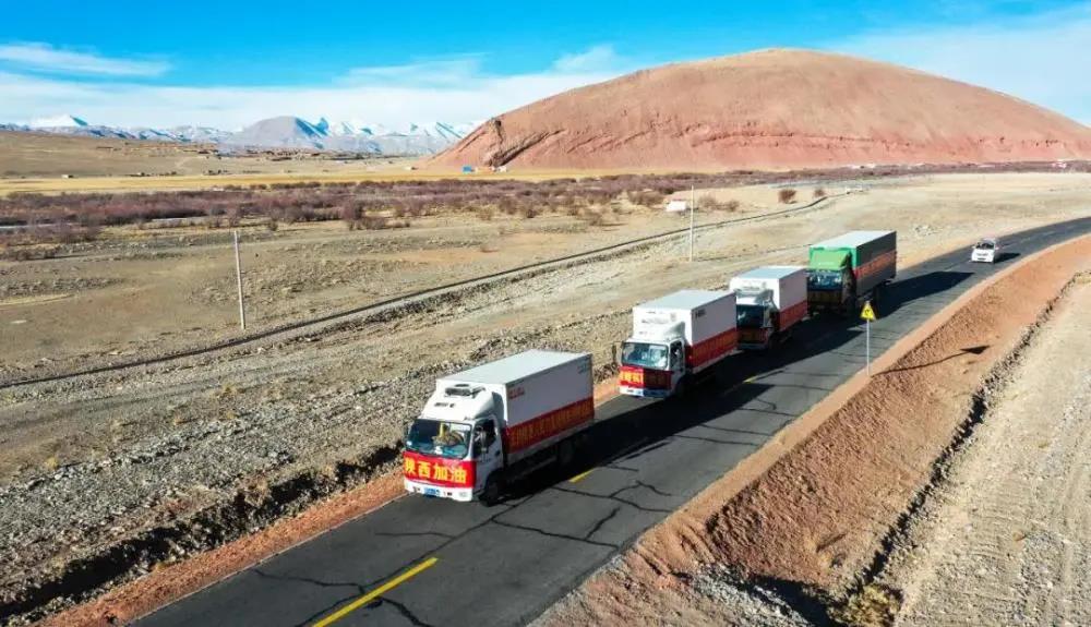 4輛滿載援助物資的卡車從(cong) 西藏阿裏地區駛向陝西省。(受訪者供圖)