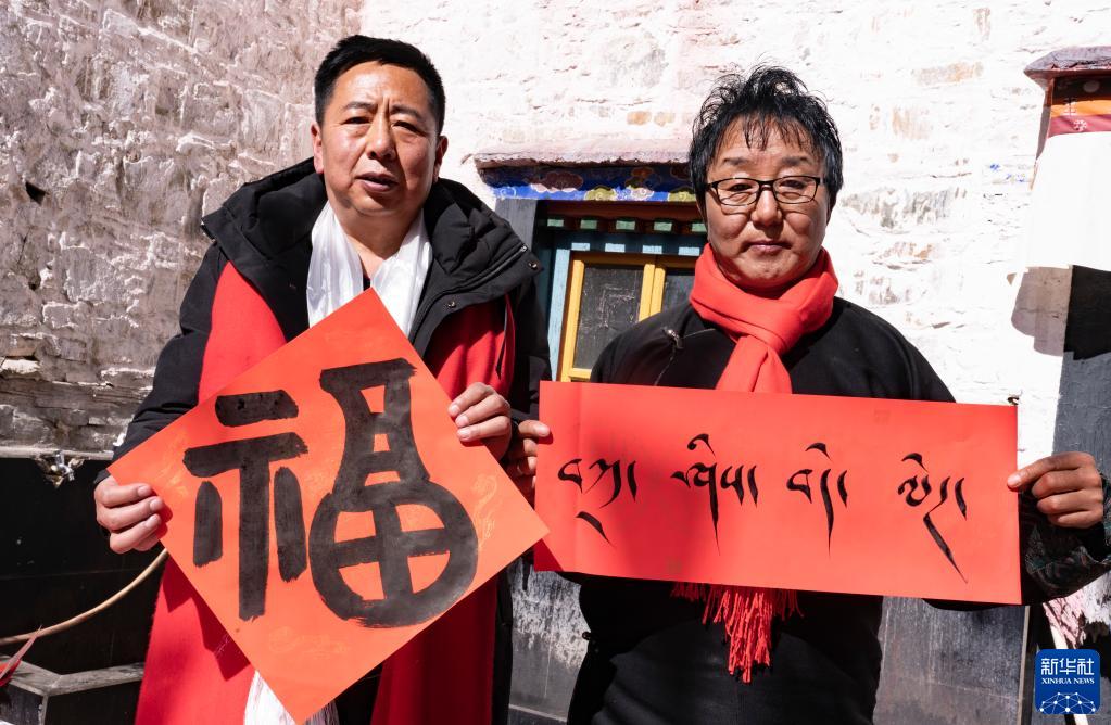 1月26日,書(shu) 法家展示現場書(shu) 寫(xie) 的祝福字。新華社記者 普布紮西 攝