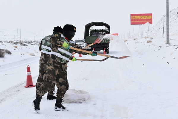 圖為(wei) 武警官兵正在緊急清理路麵積雪。貢鎳攝