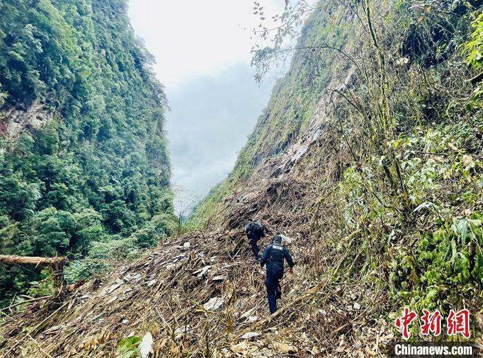 西藏自治區墨脫縣背崩鄉(xiang) 的原始叢(cong) 林是戍邊民警日常巡邏之地。1月26日中午,中新社記者隨背崩邊境派出所民警一道,踏上了原始叢(cong) 林中的巡邏路。圖為(wei) 背崩邊境派出所民警經過泥石流衝(chong) 刷區。 中新社記者 冉文娟 攝