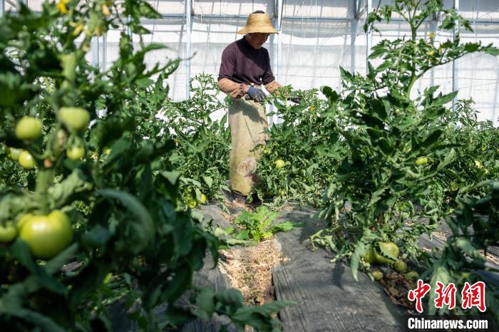 圖為(wei) 28日,白朗中農(nong) 聖域農(nong) 牧科技有限公司工作人員在為(wei) 大棚番茄授粉。江飛波 攝