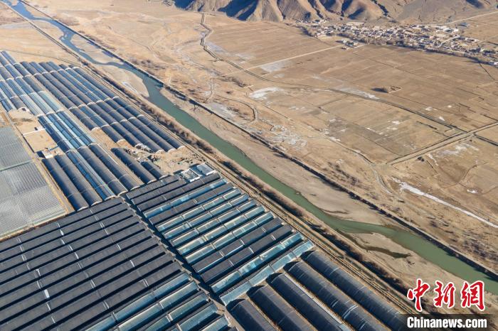 圖為(wei) 1月28日上午,航拍西藏日喀則珠峰現代農(nong) 業(ye) 科技創新博覽園蔬菜大棚。江飛波 攝
