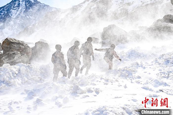 標沙拉錯哨點官兵艱難行走在風雪中。 劉誌丹 攝