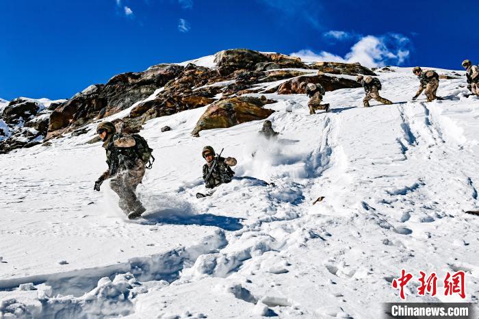 巡邏途中,官兵們(men) 順雪坡滑下,節省時間。 王江 攝