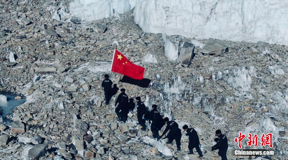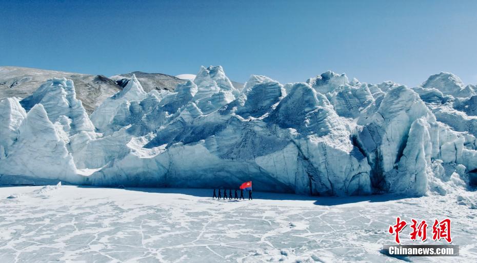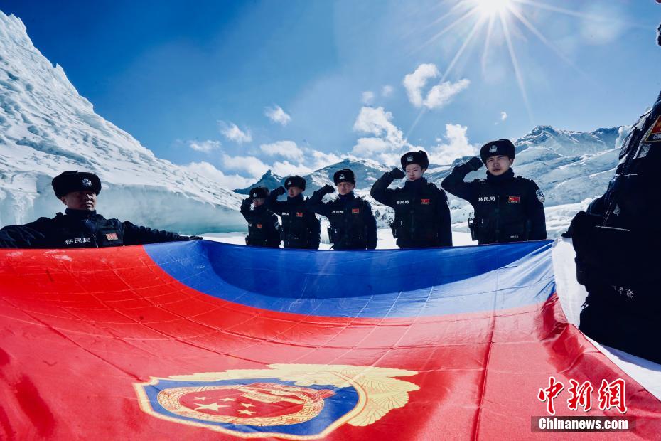 圖為(wei) 普瑪江塘邊境派出所移民管理警察在邊境冰川巡邏期間麵向警旗莊嚴(yan) 宣誓。 索朗次旺 攝