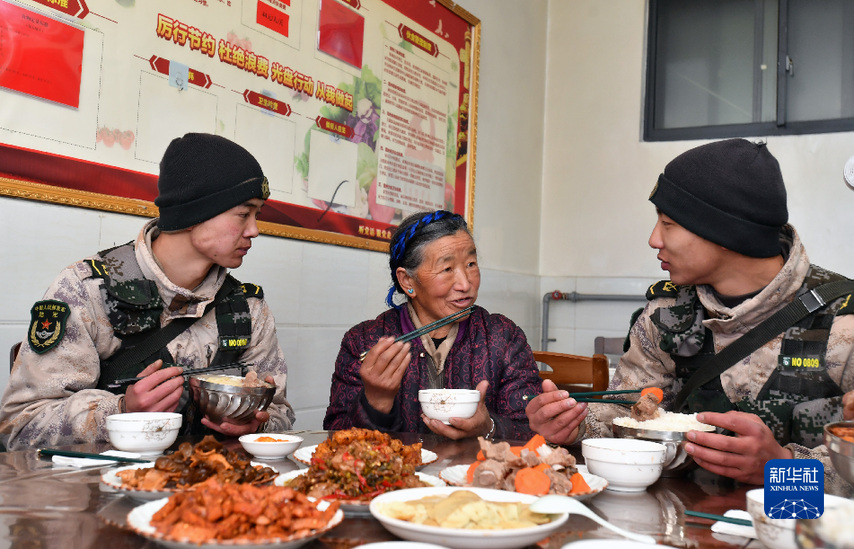 次仁曲珍老人在哨所與(yu) 戰士一起吃飯時,講述過去送菜的經曆(1月27日攝)。新華社記者 覺果 攝
