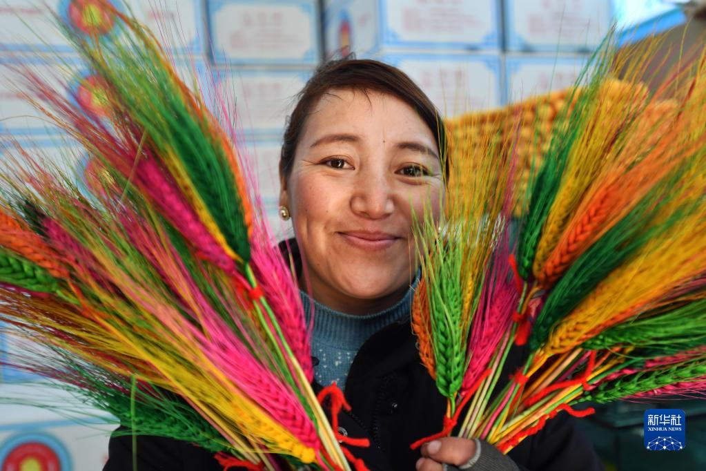藏族姑娘索曲在展示出售的象征豐(feng) 收的五彩麥穗(2月12日攝)。新華社記者 覺果 攝