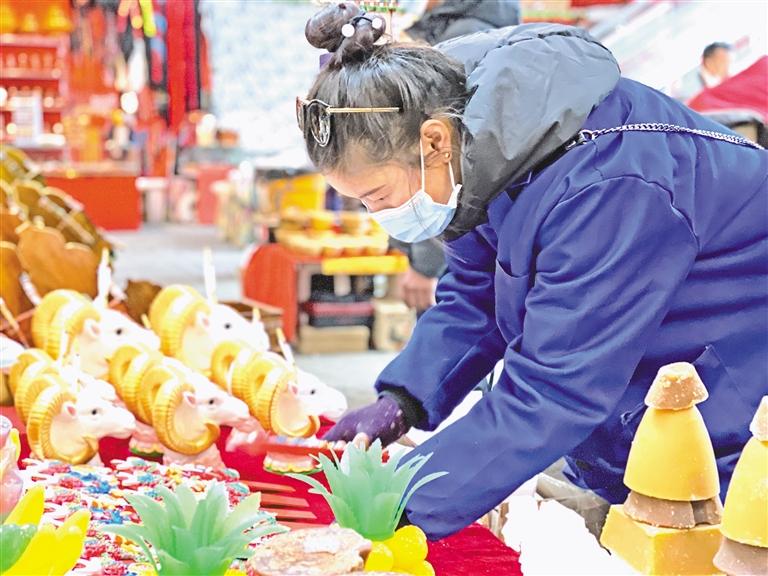 在雪域亙(gen) 古浩瀚的曆史中,高原兒(er) 女自古以來便認定“羊”是吉祥的動物,代表了藏族群眾(zhong) 祈盼來年五穀豐(feng) 登、六畜興(xing) 旺。塑彩羊頭在藏語中稱為(wei) “隆果”,一般擺放在新年布置的貢品中央。“爸媽去年購買(mai) 了一種用石灰製作的塑彩羊頭,今年我想購買(mai) 陶瓷製作的塑彩羊頭放在爸媽家,去年買(mai) 的拿回自己家,這樣既環保,也讓老人開心。”市民索朗旺堆在年貨攤位購買(mai) “隆果”時說。