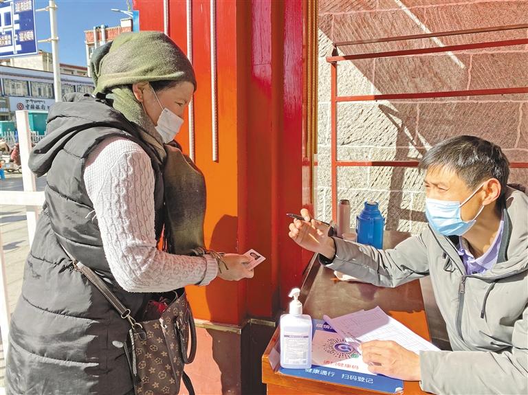 八廓商城市場部部長卓嘎介紹說:“為(wei) 廣大市民提供一個(ge) 安全、祥和的購物環境,我們(men) 在商場設有5個(ge) 進出口,每個(ge) 進出口都需掃行程碼、測量體(ti) 溫後才可進入。因為(wei) 有些老人沒有智能手機,無法掃健康瑪,我們(men) 會(hui) 登記姓名、身份證號、聯係方式。並且在增加的攤位旁增設消防器材,不定時巡邏。”