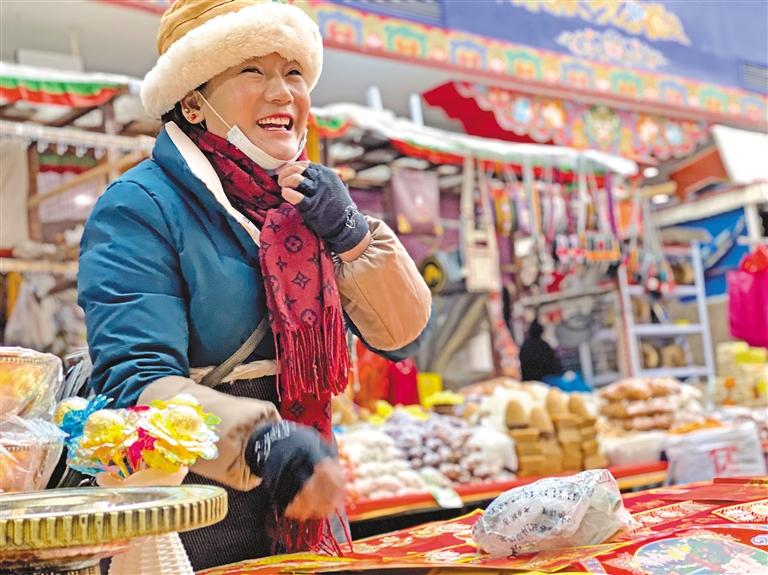 走出八廓商城,熙熙攘攘的人群中,大家眉眼帶笑,手上都拎著各式年貨,喜慶歡欣的氛圍充溢在大街小巷。藏曆新年的腳步越來越近了,古城年味日益濃。