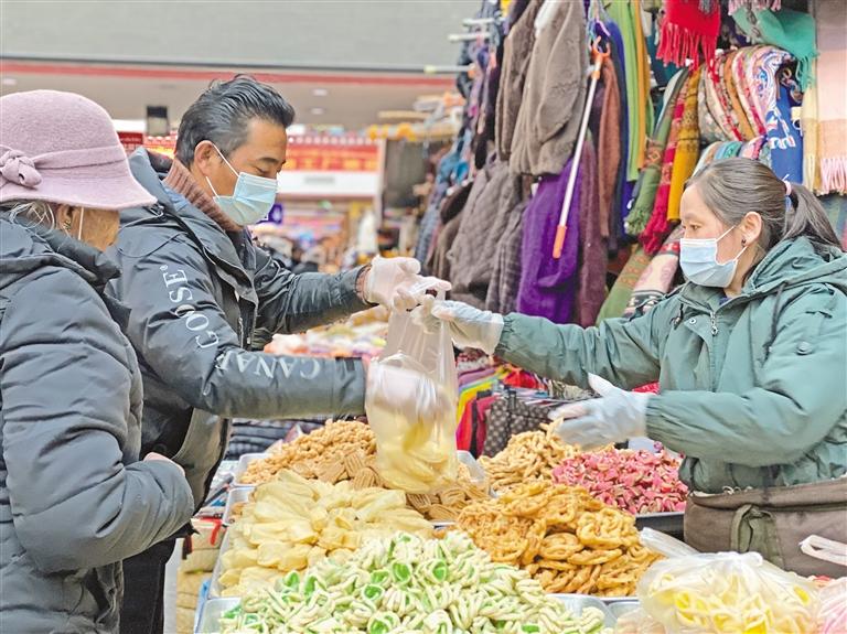 漫步八廓商城,從(cong) 一樓到三樓,攤位整齊有序。風幹的牛羊肉、色彩斑斕的“卡賽”醉人的青稞酒……從(cong) 節日用品、服裝飾品到幹果零食,各式各樣的年貨琳琅滿目。