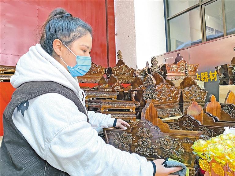 來自山南市貢嘎縣的拉吉帶著自家生產(chan) 的“切瑪盒”第2次來到八廓商城年貨市場。“由於(yu) 是自家生產(chan) ,所以我們(men) 自主設計了一款線條稍微簡約的‘切瑪盒’;還有一款傳(chuan) 統線條與(yu) 圖案的‘切瑪盒’。在顏色上,我們(men) 選擇了較為(wei) 持重的深色,這樣的顏色大氣沉穩,許多市民非常喜歡,兩(liang) 款售價(jia) 都是380元。”拉吉介紹道。
