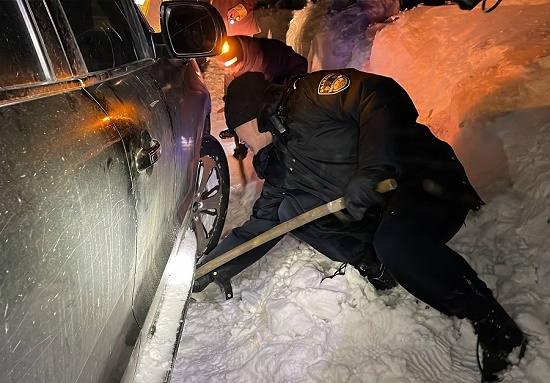 “李青昀、楊帆、呂燕洪你們(men) 幾個(ge) 帶上鐵鍬、強光手電、撬棍和我走!”元宵節前夕的一個(ge) 晚上,金東(dong) 邊境派出所教導員鄭宏強在走廊上喊到。那聲音堅定而洪亮,一副“幹架”的氣勢。原來是接朗縣公安局指揮中心轉警稱:“有遊客駕車途經219國道本布拉山埡口時,車子陷入積雪中被困,車上共有3人,其中一名是72歲的老人,車上燃油已不多,請出動警力進行救援!”