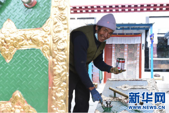 2月23日,曲水縣三有村村民旺堆在自家門上刷漆。新華網 旦增努布 攝
