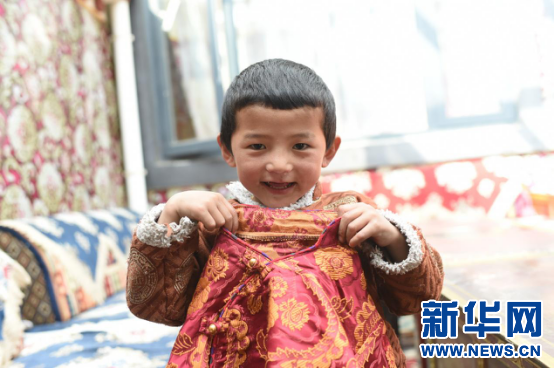 2月27日,在榮瑪鄉(xiang) 高海拔生態搬遷點藏曲村今年5歲的晉美塔傑展示新年的衣服。新華網 旦增努布 攝