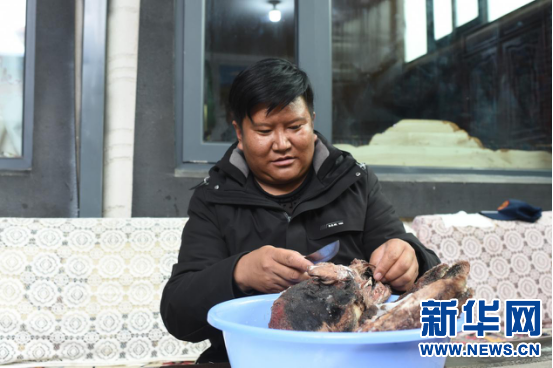2月27日,在榮瑪鄉(xiang) 高海拔生態搬遷點村民達娃次仁在清洗羊頭。新華網 旦增努布 攝