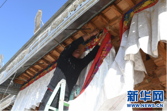 3月2日,乃東(dong) 區郭沙村村民巴桑在更換大門的香布(一種藏式裝飾)。新華網 旦增努布 攝