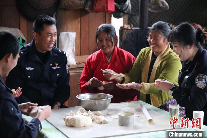 圖為(wei) 背崩邊境派出所的民警和轄區民眾(zhong) 一起包餃子。呂恒剛 攝