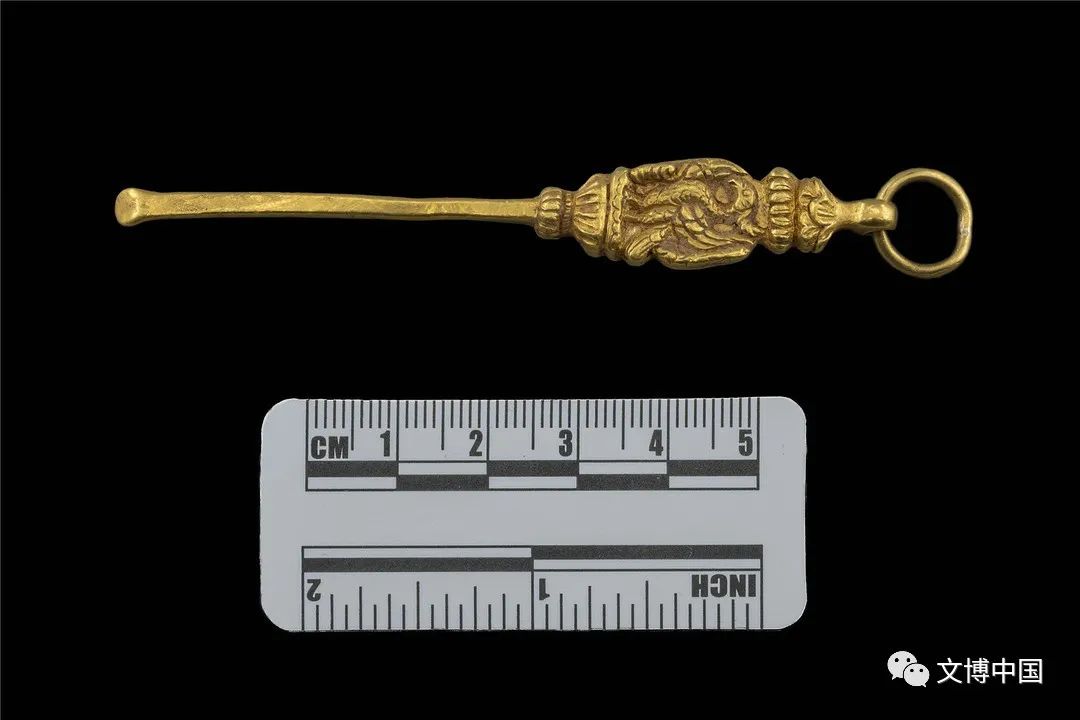 大型墓葬被盜擾情況較為(wei) 嚴(yan) 重,僅(jin) 結構保存較好,出土遺物普遍較少,小型墓葬未見明顯的盜擾痕跡,但隨葬品極少。出土遺物主要有金銀器,包括雄獅鳥紋金耳勺、植物紋金飾件、銅鍍金覆麵、陰刻花紋銀飾件、銀帶扣和金珠、銀珠等;狗頭金;青金石、瑪瑙、珊瑚、鬆石、珍珠等飾件;陶器(陶片),包括1件鴨嘴流單耳平底罐和若幹彩繪赭麵人物形象的陶片,屬青藏高原首次發現;銅器,包括銅鏡、銅鈴、銅杯、銅勺、銅錐狀器等;鐵器殘件,可辨器型有鐵箭鏃等;漆皮殘片;貝類製品;紡織物;擦擦;石質黑白圍棋子等。