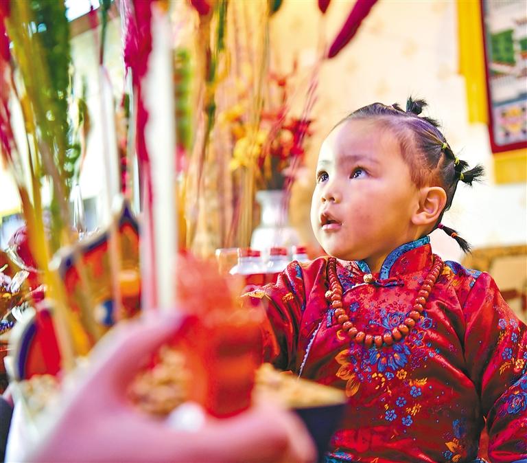 藏曆新年期間,西藏各地群眾(zhong) 以多種方式歡度新年。圖為(wei) 身著藏裝的小姑娘在吃“切瑪”。新華社記者 晉美多吉 攝