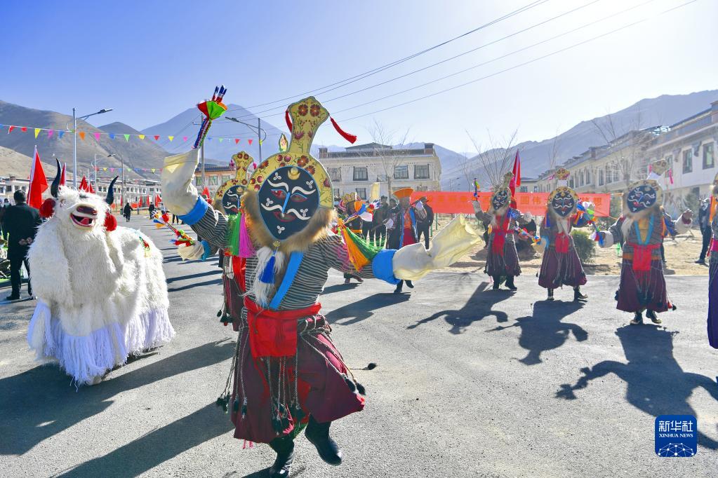 3月28日,南木林縣卡孜鄉(xiang) 群眾(zhong) 在湘河水庫移民新村表演藏戲。新華社記者 張汝鋒 攝