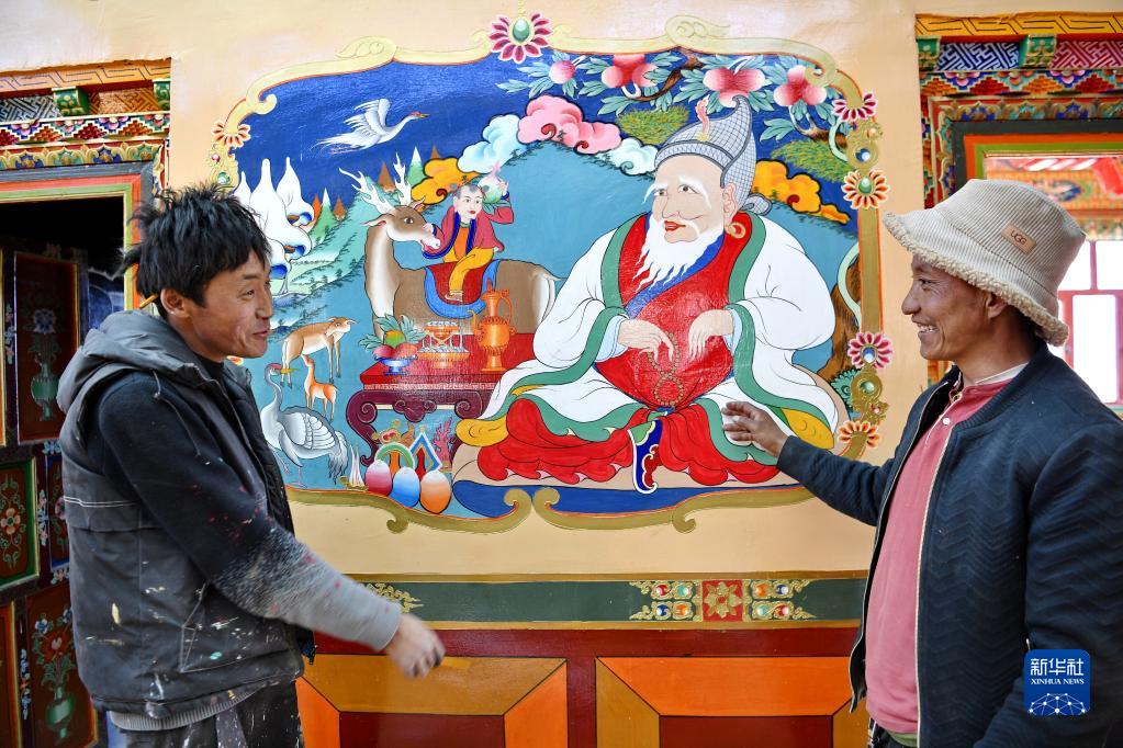 在湘河水庫移民新村,搬遷群眾(zhong) 拉巴旦增(右)與(yu) 為(wei) 自家新居繪製壁畫的民間藝人普布次仁交流(3月27日攝)。新華社記者 張汝鋒 攝
