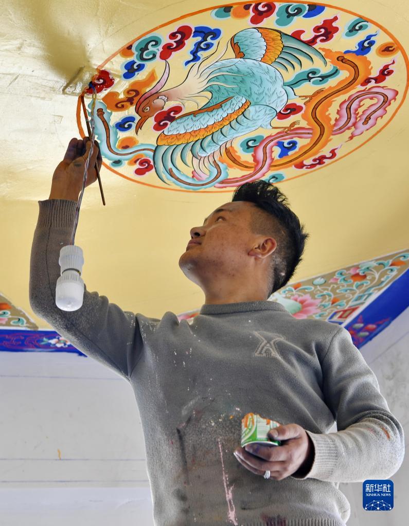 來自日喀則的民間藝人在湘河水庫移民新村一處民居繪製屋頂(3月27日攝)。新華社記者 張汝鋒 攝