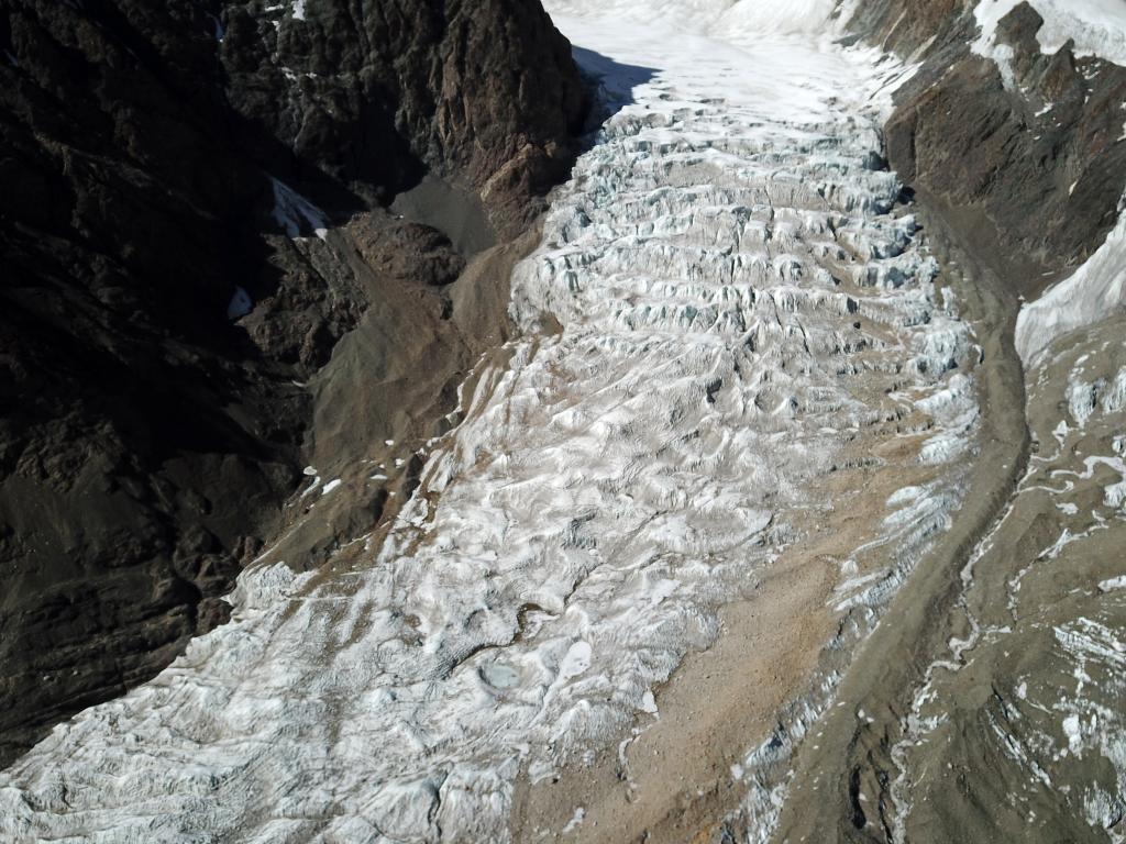 2022年3月27日拍攝的窮母崗日峰腳下的冰川。(無人機照片,新華社記者 薑帆 攝)