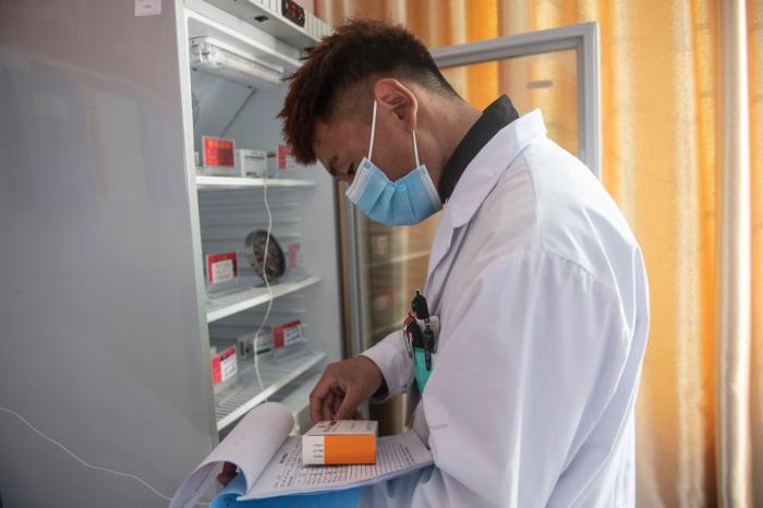 米瑪次仁在林芝市巴宜區更章鄉(xiang) 衛生院清點疫苗庫存情況(2021年12月24日攝)。新華社記者 孫瑞博 攝