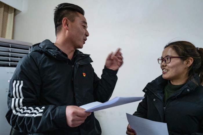 鐵忠福(左)在昂仁縣與(yu) 同事交流工作(2021年12月21日)。新華社記者 孫瑞博 攝