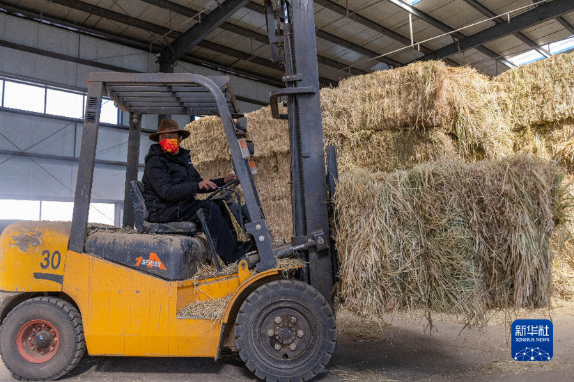 貢培在西藏娘亞(ya) 犛牛養(yang) 殖產(chan) 業(ye) 發展有限責任公司的飼草料倉(cang) 庫工作(3月30日攝)。新華社記者 周荻瀟 攝