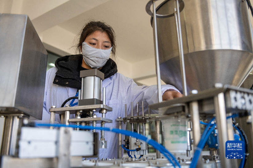 工作人員在西藏娘亞(ya) 犛牛養(yang) 殖產(chan) 業(ye) 發展有限責任公司的酸奶生產(chan) 車間作業(ye) (3月30日攝)。新華社記者 周荻瀟 攝