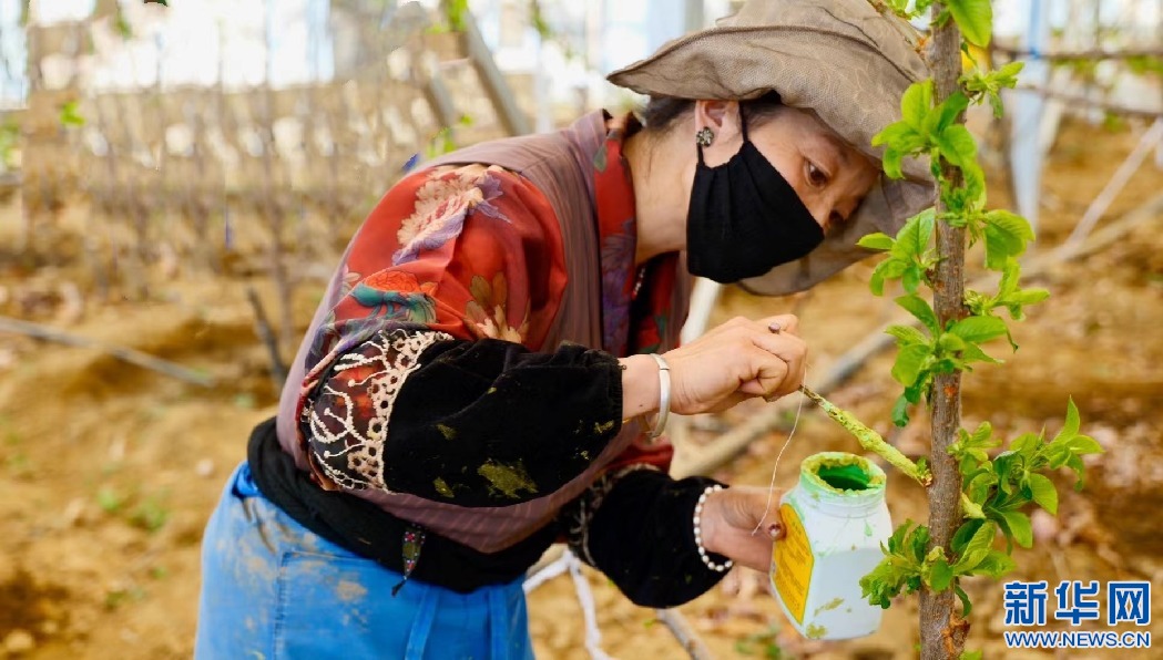 工作人員在檢查車厘子花有無病害。新華網 雪珍 攝
