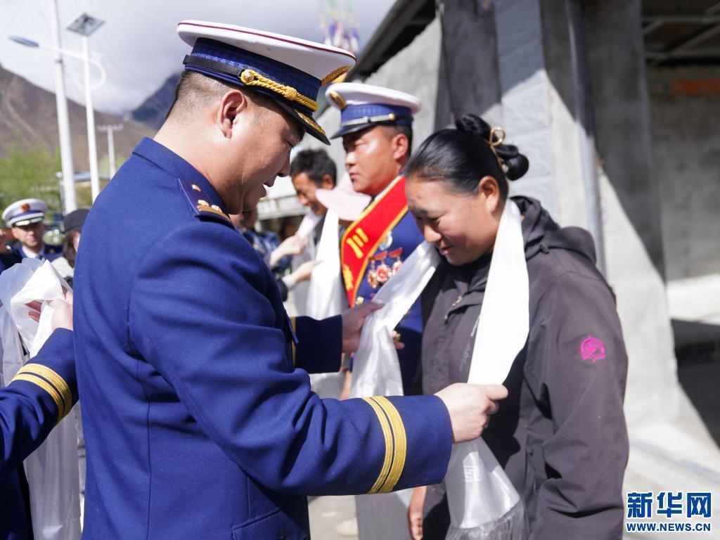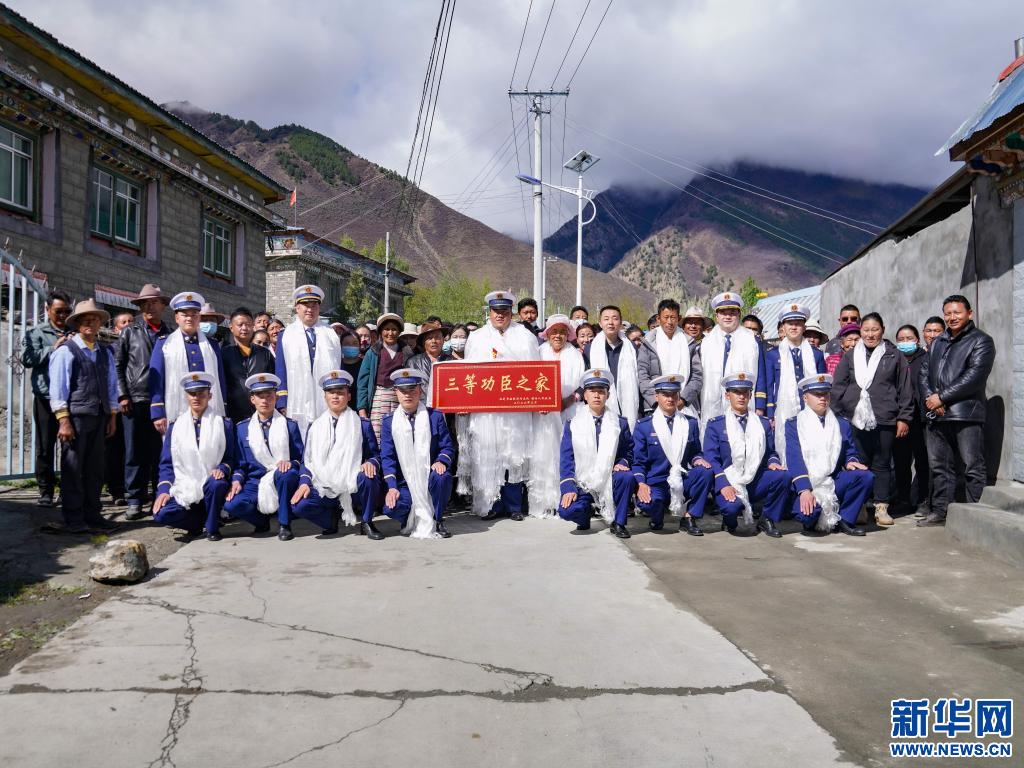 西藏林芝市朗縣洞嘎鎮聶村村民夾道歡迎榮立三等功的消防員洛桑頓珠(4月15日攝)。(李國燾攝 新華網發)