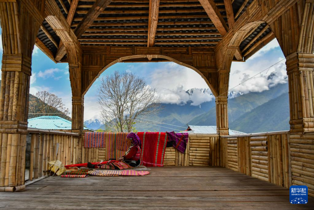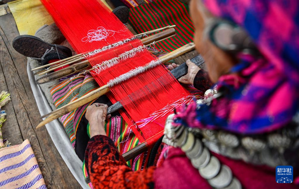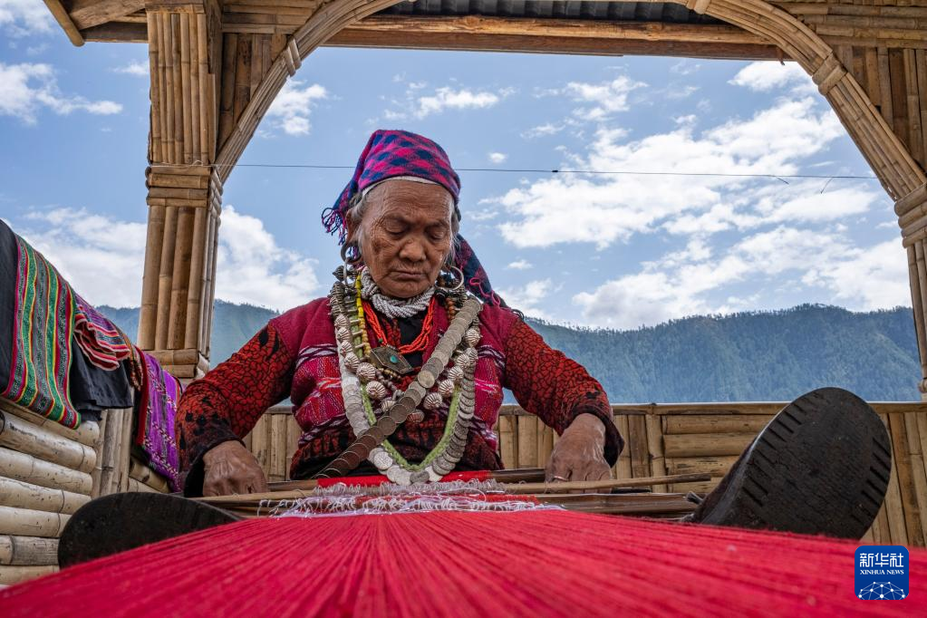 今年72歲的本央老人,是僜人服飾製作技藝西藏自治區級非遺傳(chuan) 承人。在西藏林芝市察隅縣沙瓊村,老人身著傳(chuan) 統的僜人服飾,在自家的涼亭裏編織布料。