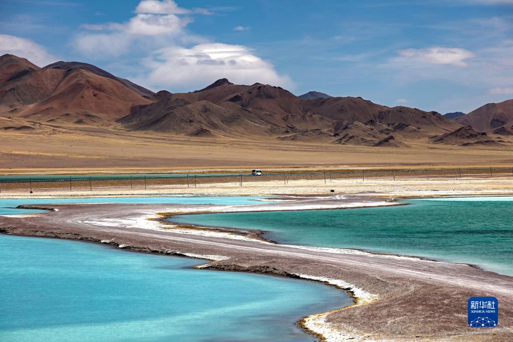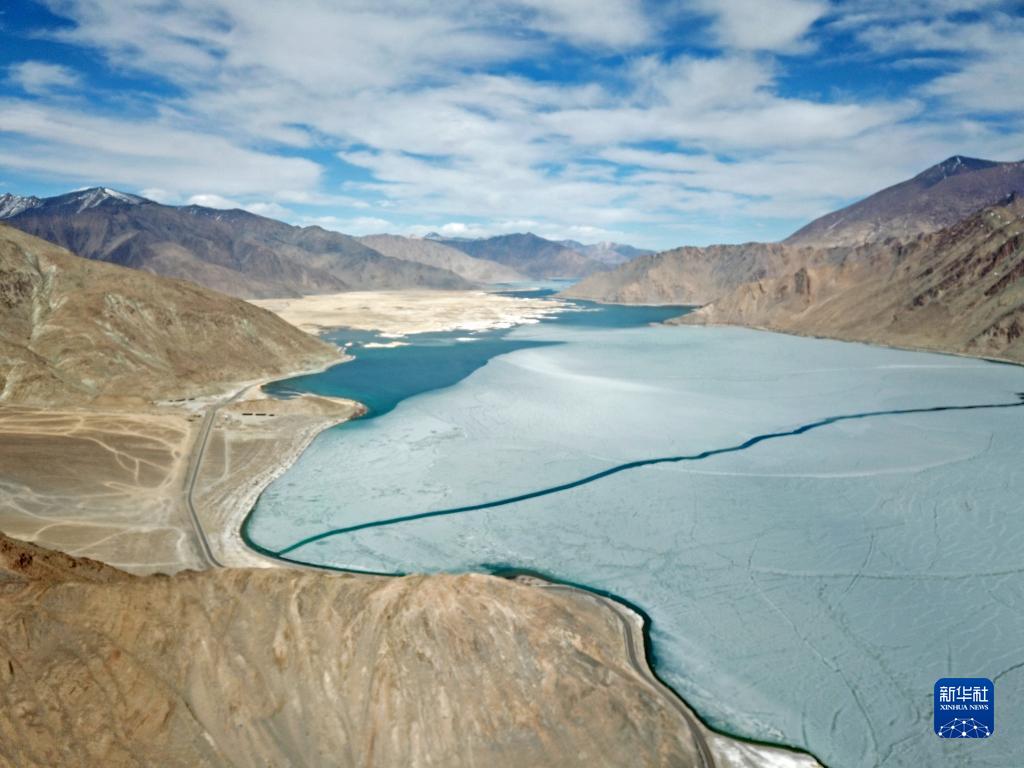這是位於(yu) 西藏自治區阿裏地區改則縣的物瑪錯,湖水呈現出不同顏色(2022年4月12日攝)。新華社記者 薑帆 攝