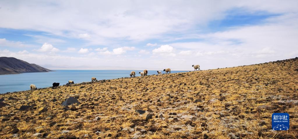 在位於(yu) 西藏自治區那曲市的巴木錯,羊群在湖邊吃草(2022年4月13日攝,手機照片)。新華社記者 沈虹冰 攝