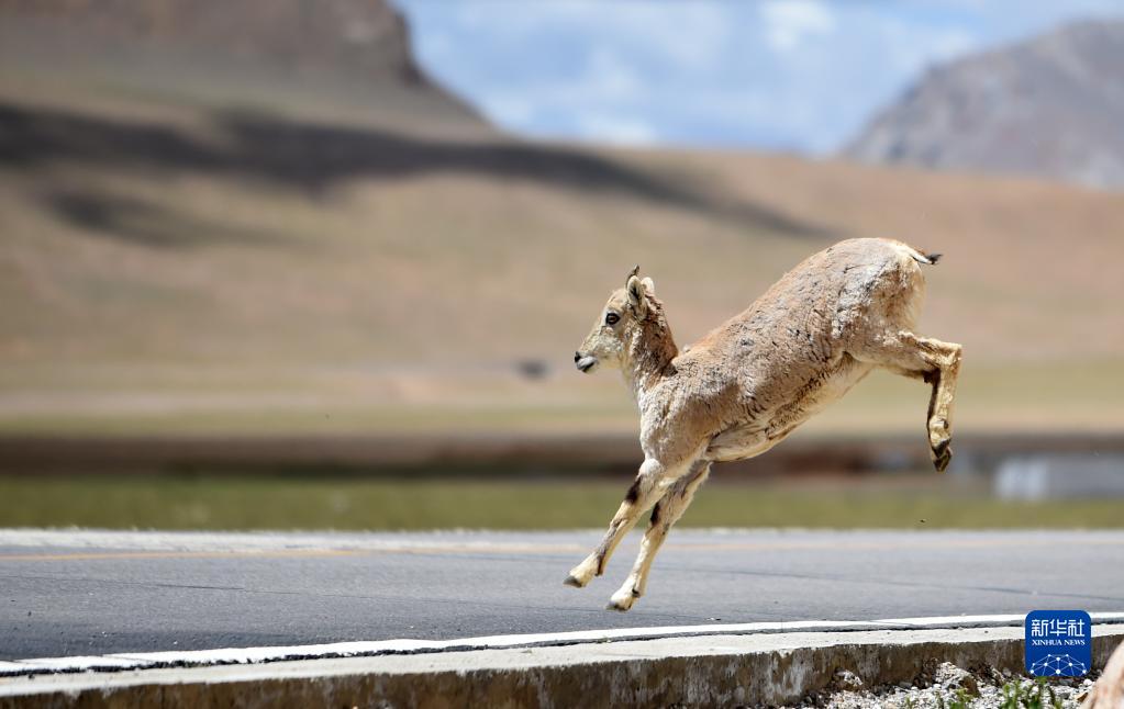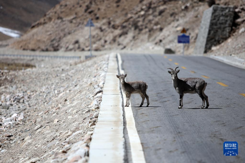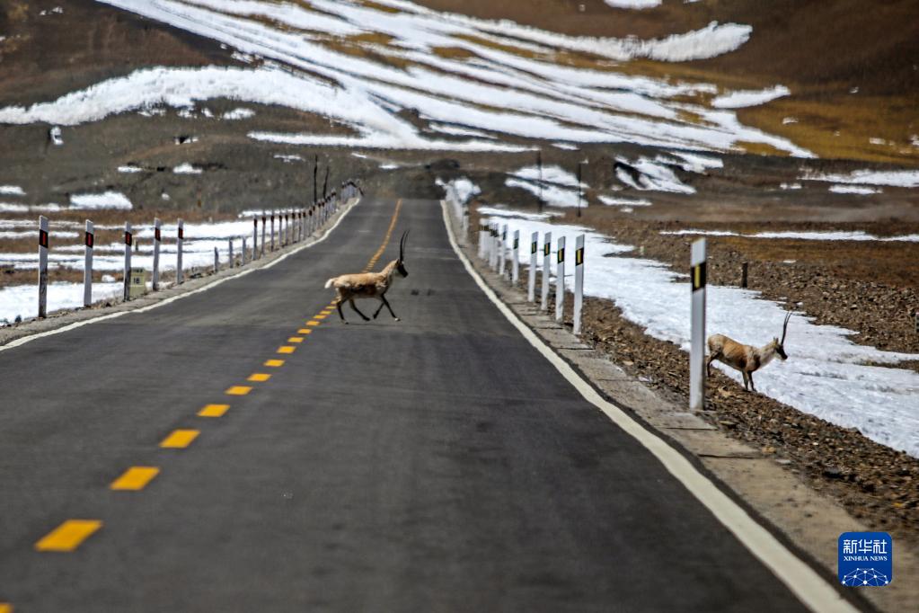 兩(liang) 頭藏羚羊在阿裏地區日土縣橫穿公路(4月9日攝)。新華社記者 薑帆 攝