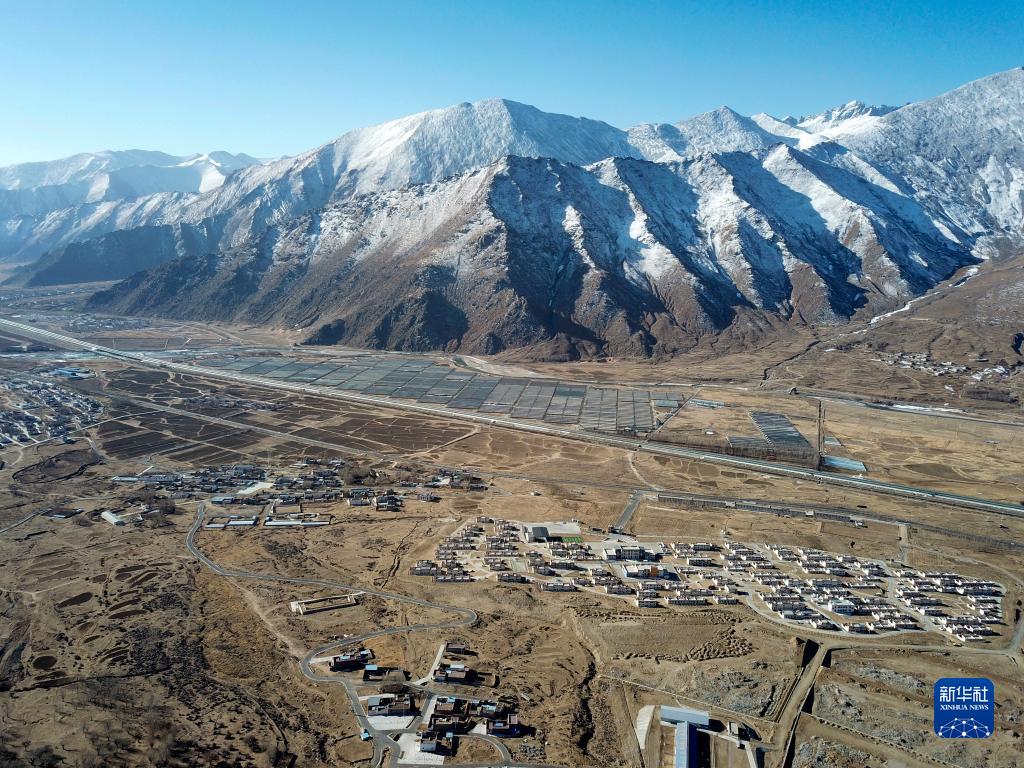這是拉薩市堆龍德慶區古榮鎮榮瑪高海拔生態搬遷點的全景,高速公路、國道、鄉(xiang) 村道路使搬遷點與(yu) 外麵的世界連接通暢(無人機照片,2月28日攝)。新華社記者 薑帆 攝