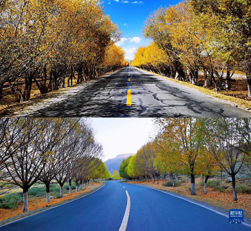 這是拉薩市林周縣的鄉(xiang) 村道路(手機拚版照片,2021年10月16日攝)。新華社記者 沈虹冰 攝