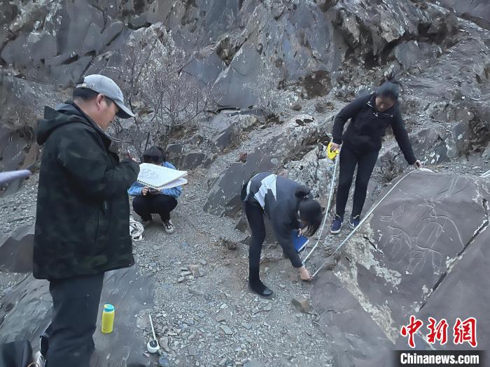 圖為(wei) 日喀則石刻藝術博物館工作人員測量岩畫尺寸。日喀則石刻藝術博物館供圖