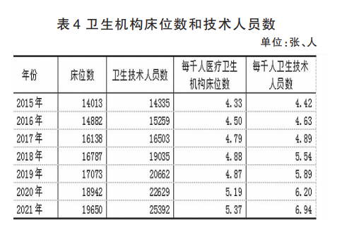 年末全區共有衛生機構1650個(ge) 。其中,醫院179個(ge) ,鄉(xiang) (鎮)衛生院675個(ge) ,社區衛生服務中心(站)14個(ge) ,疾病預防控製中心82個(ge) ,婦幼保健院(站)36個(ge) 。醫療衛生機構實有床位數19650張。其中醫院14808張。衛生技術人員25392人。其中執業(ye) (助理)醫師10448人。每千人醫療衛生機構床位數5.37張。每千人衛生技術人員數6.94人。每千人執業(ye) (助理)醫師數2.85人。
