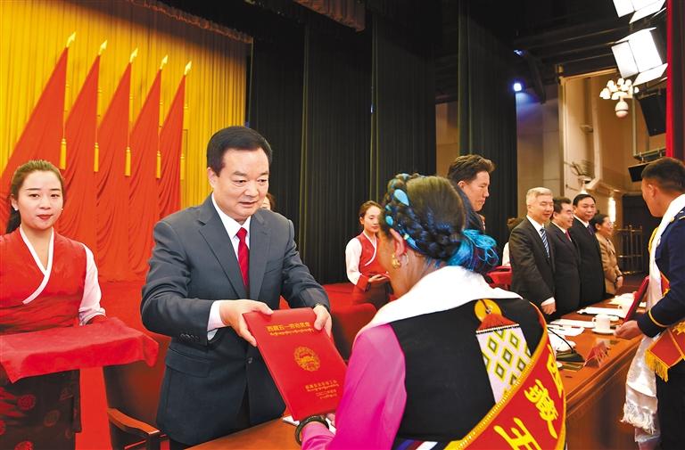 4月29日上午,西藏自治區慶祝“五一”國際勞動節暨表彰大會(hui) 在拉薩舉(ju) 行。自治區黨(dang) 委書(shu) 記王君正出席會(hui) 議並講話。這是王君正為(wei) 受表彰代表頒獎。記者 旦增西旦 攝