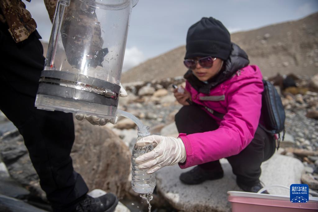 在珠峰登山大本營,科研人員提取冰川融水裏的微生物(4月30日攝)。新華社記者 孫非 攝