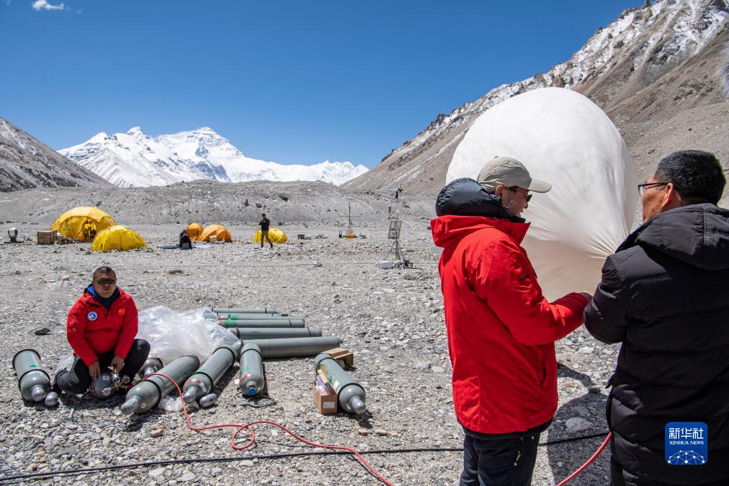 在珠峰登山大本營,科研人員施放大氣臭氧探空氣球(5月3日攝)。新華社記者 孫非 攝