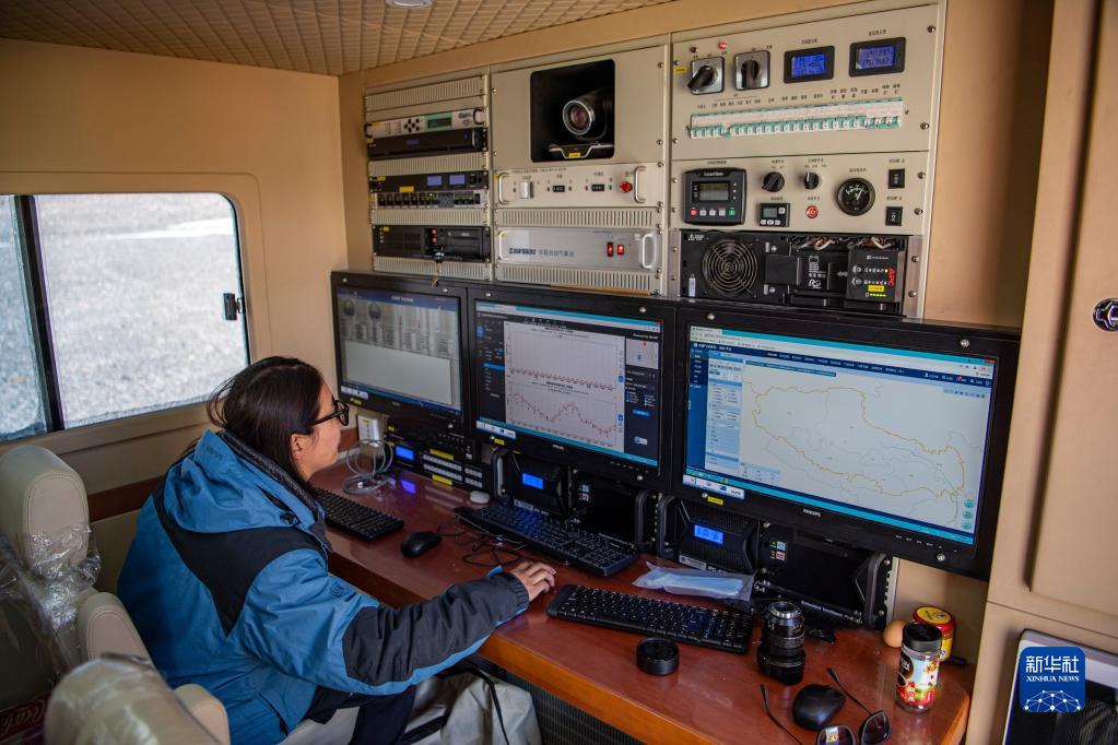 在珠峰登山大本營的氣象應急保障車內(nei) ,西藏自治區氣象局工作人員在查看實時氣象數據(5月3日攝)。新華社記者 孫非 攝