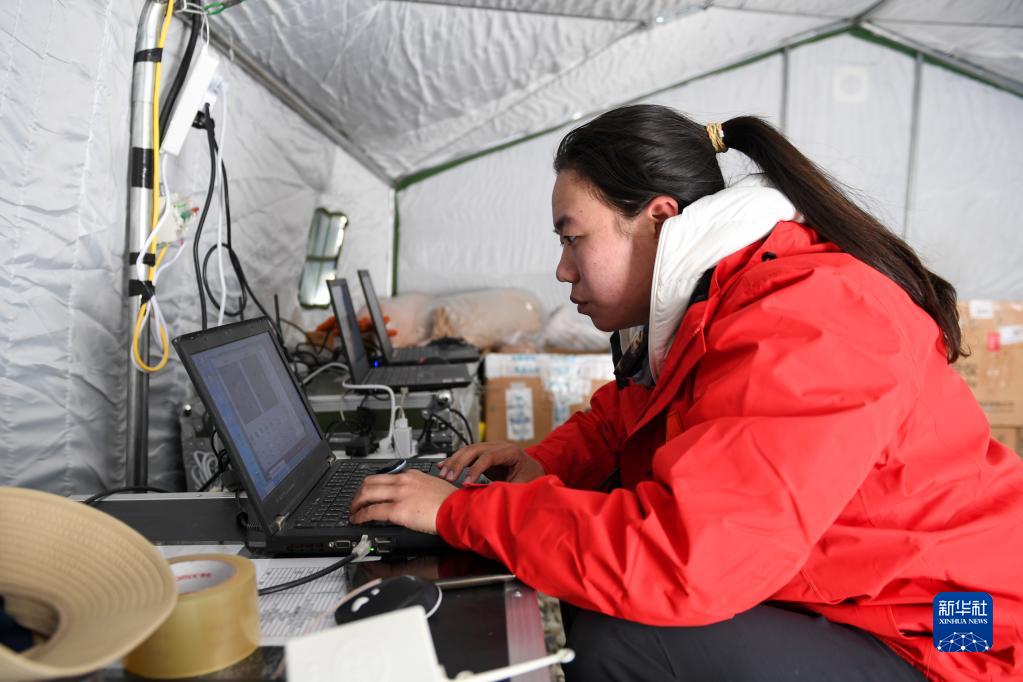 在珠峰登山大本營,科研人員查看數據(5月2日攝)。新華社記者 薑帆 攝