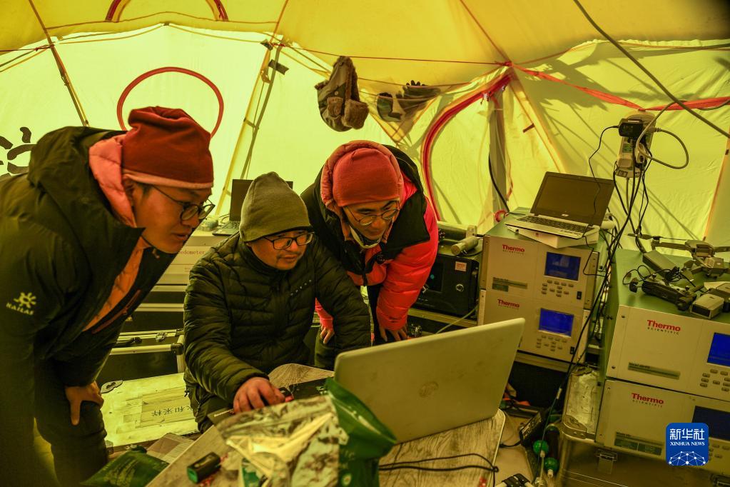 5月3日,在珠峰登山大本營,科研人員查看大氣數據。新華社記者 薑帆 攝